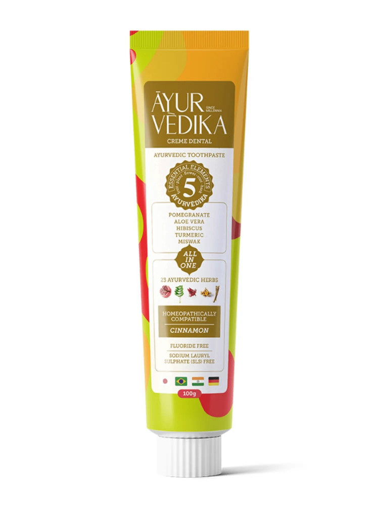 | Creme Dental Ayurvédico Sem Flúor - Cinnamon: Combina medicina ayurvédica e homeopatia em uma fórmula 100% natural. Canela e bio-ativos fortalecem dentes e gengivas, enquanto romã e cúrcuma garantem ação antibacteriana. Vegano, sem SLS, flúor ou parabenos. Tripla ação de limpeza para um sorriso saudável e brilhante. |