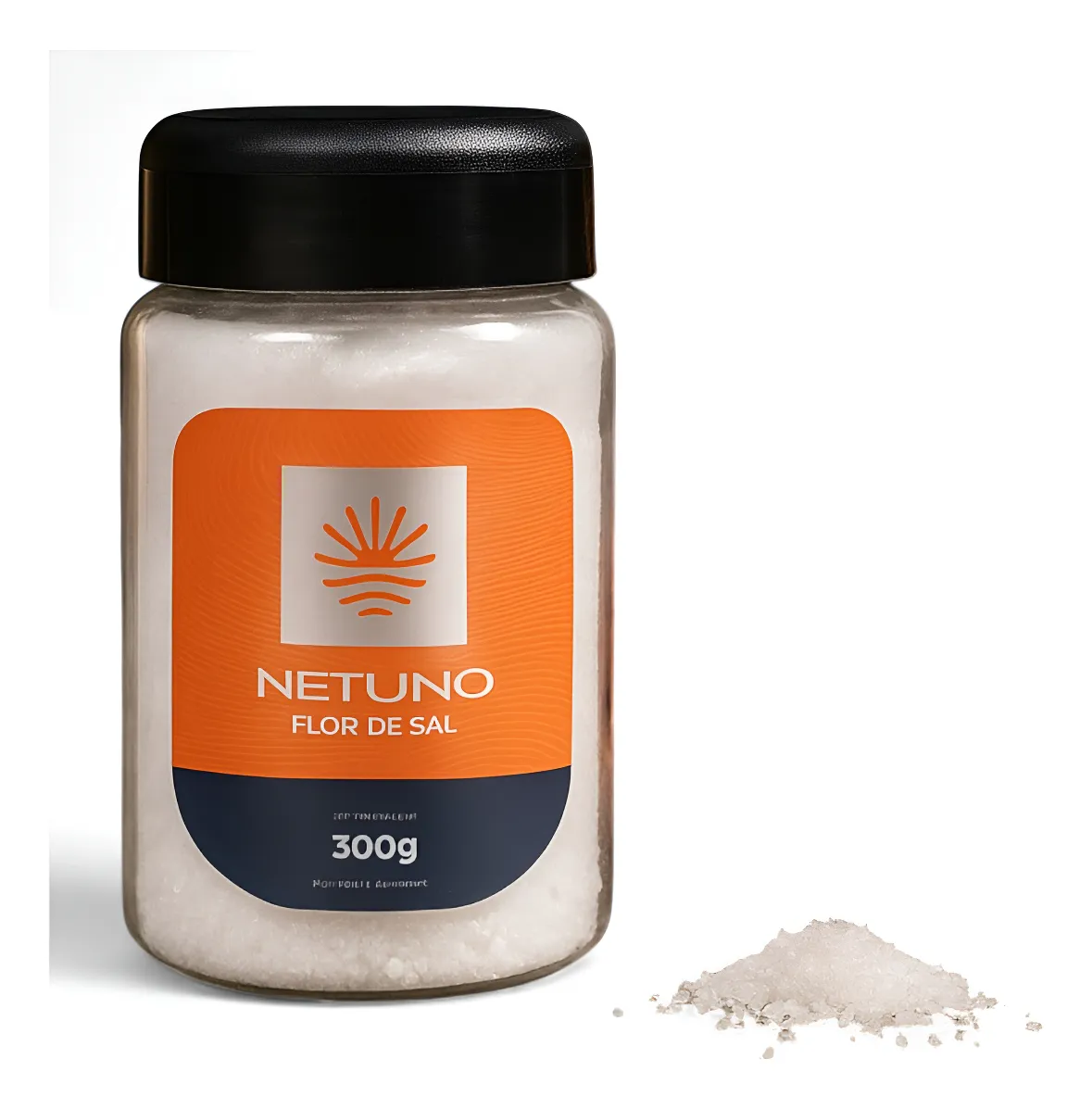 A **Flor de Sal Netuno** é fruto de um delicado processo artesanal, sendo altamente valorizada no universo da alta gastronomia. Formada pela fina e rara camada de cristais que surge na superfície da água do mar em condições climáticas específicas, sua colheita é manual, preservando toda a pureza e autenticidade do produto.