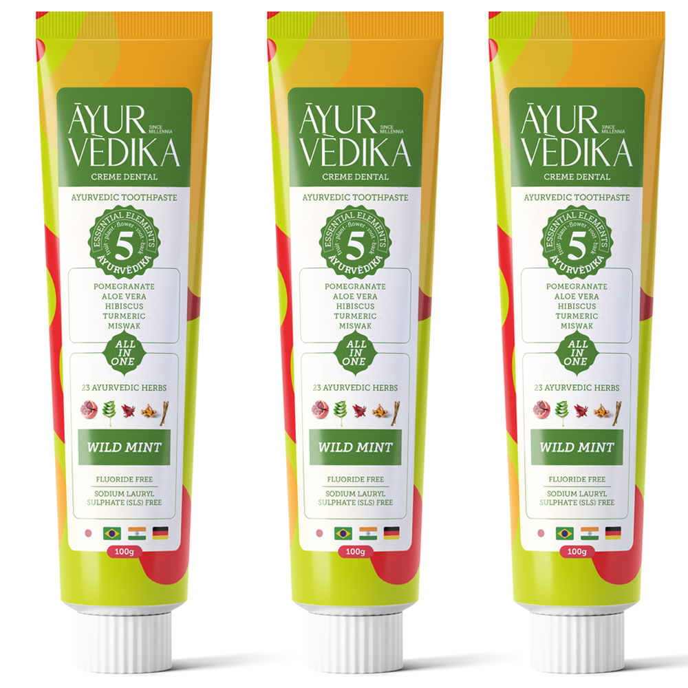Kit composto por 3 Cremes Dentais Wild Mint Ayurvédico Sem Flúor Vegano Limpeza Profunda e Natural com Menta Selvagem - Produto Vegano, Transforme sua rotina de higiene bucal com o Creme Dental Ayurvédico Sem Flúor Wild Mint.Uma inovação no cuidado bucal, este creme dental combina tecnologia de ponta com os princípios milenares da Ayurveda, proporcionando uma limpeza eficaz e natural, sem comprometer sua saúde ou o meio ambiente.Benefícios do Creme Dental Ayurvédico:Fórmula Revolucionária e Natural: Com 23 ingredientes ayurvédicos, incluindo a poderosa menta selvagem, este creme dental não apenas limpa, mas também refresca o hálito e combate as bactérias causadoras de cáries de forma eficaz.Tecnologia Avançada: Utiliza sílicas e carbonatos especiais que garantem uma limpeza mecânica profunda com mínima abrasividade, preservando o esmalte dos dentes e promovendo uma saúde bucal completa.Sem Flúor e Substâncias Nocivas: Perfeito para quem busca um cuidado bucal consciente, este creme dental é livre de flúor, SLS, parabenos, petrolatos, metais pesados, agrotóxicos e outros aditivos artificiais.Hidratação e Proteção Extra: Enriquecido com Bio Hyaluronic Acid para combater a secura bucal e 4-Terpineol, derivado do óleo essencial de tea tree, que amplia as propriedades antimicrobianas e anti-inflamatórias, garantindo um sorriso saudável e protegido.Cuidado Bucal Completo e Sustentável:O Creme Dental Ayurvédico Sem Flúor Wild Mint é 100% vegano e desenvolvido com ingredientes nobres, oferecendo uma solução natural e eficaz para sua saúde bucal.Odontologicamente testado, sua fórmula antioxidante, anti-inflamatória e cicatrizante é ideal para toda a família.Adquira agora o Kit 3 Cremes Dentais Wild Mint Ayurvédico Sem Flúor Vegano e experimente um cuidado bucal que une sofisticação, eficácia e respeito ao meio ambiente.Conteúdo: 3 cremes dentais com 100 g cada